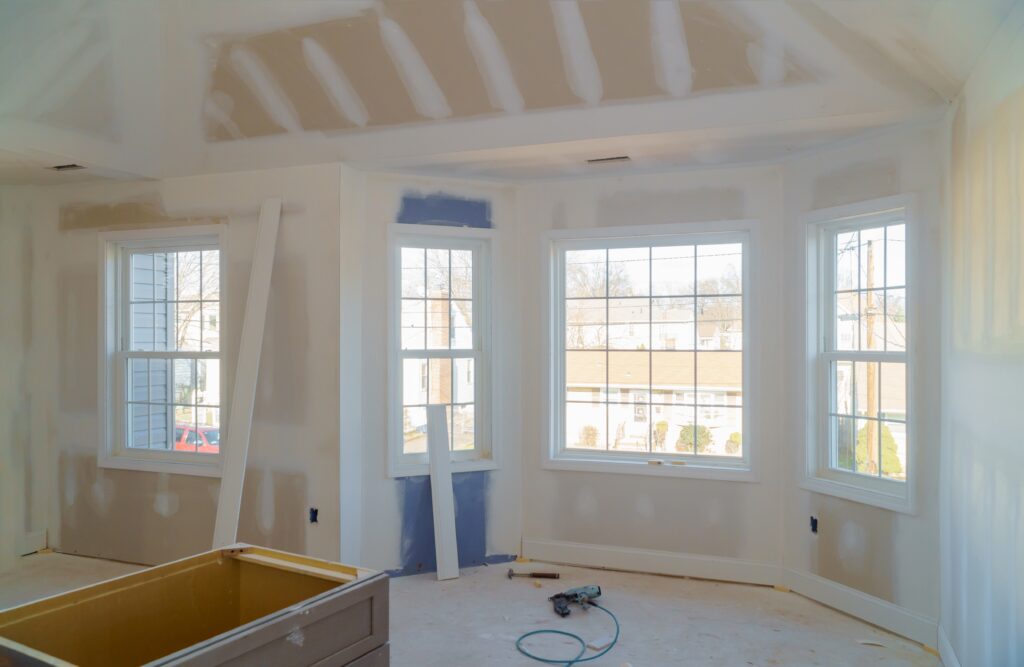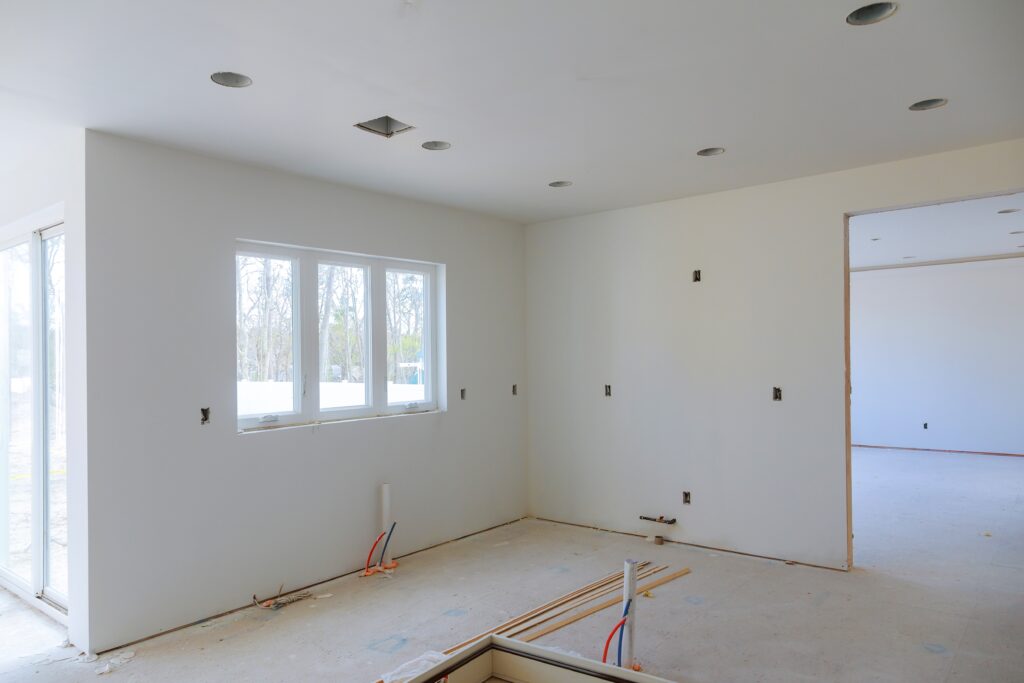 Application d’enduit de finition sur murs et plafonds, obtenant ainsi une surface parfaitement lisse.