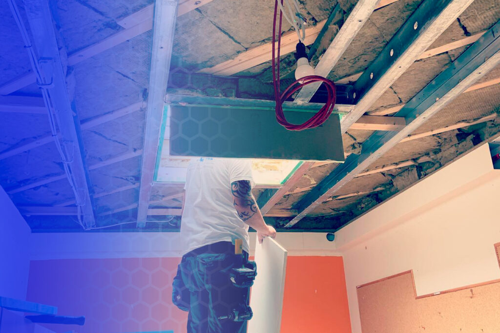 Plafonds en plaques de plâtre, plafonds acoustiques, plafonds résistant à l’humidité (WR), plafonds en dalles (Rockfon, Eurocoustic), plafonds métalliques (Luxalon, Hunter Douglas), lambris, MDF extérieur.